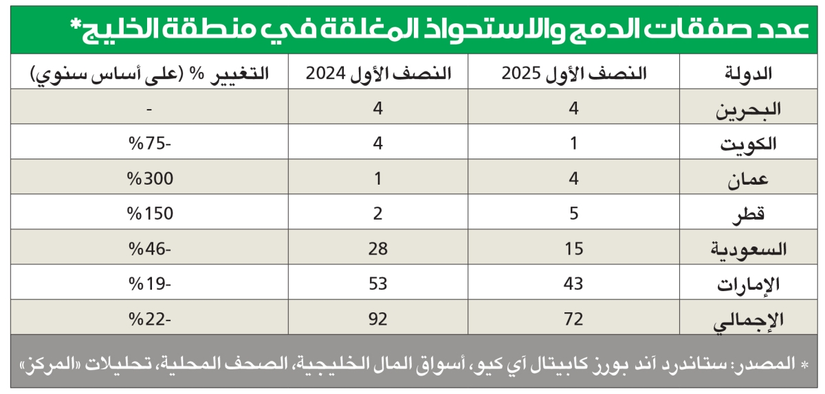 وإضافة إلى ذلك، أبرمت جهات الاستحواذ الخليجية 39 صفقة عابرة للحدود خلال النصف الأول من عام 2025، وهو ما يطابق الصفقات ذاتها في النصف الأول من عام 2024. وللإشارة فإن المشترين من الإمارات تصدروا النشاط العابر للحدود، حيث مثلوا حوالي 71% من إجمالي عدد الصفقات المغلقة العابرة للحدود، تلتها كل من المملكة العربية السعودية والكويت بنسبة 13% و8% على التوالي. المشترون الأجانب أظهرت دول مجلس التعاون الخليجي تحولاً في اهتمام المشترين الأجانب، إذ شهدت الشركات المستهدفة بالمنطقة انخفاضاً طفيفاً في اهتمام المشترين الأجانب خلال هذه الفترة، حيث أبرموا 24 صفقة مقارنة بـ 30 صفقة العام الماضي، بانخفاض قدره 20% على أساس سنوي. وعلى الرغم من ذلك، ظلت الشركات المستهدفة في الإمارات الوجهة الرئيسية للمشترين الأجانب، إذ شهدت الدولة إبرام 19 صفقة في النصف الأول من عام 2025. نظرة على القطاعات من جهة أخرى، شملت الصفقات المُبرمة في النصف الأول من عام 2025 شركات في قطاعات متنوعة، لتؤكد الاتجاه المستمر، الذي تم تسجيله في الفترات الأخيرة. وعلى الرغم من ذلك، برزت قطاعات السلع الاستهلاكية والخدمات المالية والصناعات والتعليم وتقنية المعلومات، باعتبارها الأكثر نشاطاً، إذ شكلت مجتمعة نسبة 58% من الصفقات المبرمة خلال هذه الفترة. صفقات معلنة قيد التنفيذ بحلول نهاية النصف الأول من عام 2025، بلغ إجمالي الصفقات المعلنة قيد التنفيذ 40 صفقة في انخفاض ملحوظ مقارنة بالعام السابق، الذي شهد 55 صفقة معلنة. وركزت معظم هذه الصفقات على شركات مستهدفة من الإمارات، إذ شكلت 55% من إجمالي عدد الصفقات المعلنة، تلتها السعودية والبحرين بنسبة 23% و10% على التوالي. وشملت الصفقات المتبقية شركات مستهدفة من الكويت وقطر وعُمان، بينما شهدت كل المناطق انخفاضاً يتراوح بين الصفر والسالب في النصف الأول من عام 2025 مقارنة بالعام السابق. «كوينبيس» تتصدر وكشف تقرير «المركز» أن شركة كوينبيس غلوبال (كوينبيس) تصدرت قائمة أبرز صفقات الاندماج والاستحواذ في دول مجلس التعاون الخليجي خلال النصف الأول من عام 2025، نتيجة للصفقة التي أعلنت عنها الشركة الأميركية بقيمة 2.9 مليار دولار، لتستحوذ من خلالها بالكامل على شركة «ديريبت إف زي إي»، وهي منصة تداول مشتقات العملات المشفرة في دبي. وتُعدّ الصفقة الأكبر من نوعها في سوق العملات المشفرة حتى اليوم. وسجلت شركة «جي 42» القابضة ثاني أكبر صفقة في النصف الأول من عام 2025 بعد استحواذها على حصة 40% المتبقية في شركة خزنة داتا سنتر (خزنة) من شركة مجموعة الإمارات للاتصالات (إي آند)، بقيمة 2.2 مليار دولار. تم تأسيس شركة خزنة في عام 2022 من قبل جي 42 ومجموعة الإمارات للاتصالات (إي آند)، وهي مطور ومشغل رائد لمراكز البيانات الضخمة. وفي المرتبة التالية، جاءت صفقة بنك وربة التي استحوذ من خلالها على نسبة 33% من بنك الخليج عبر الاستحواذ الكامل على شركة الغانم التجارية بقيمة إجمالية بلغت 1.6 مليار دولار. وبدأ كل من بنك وربة وبنك الخليج على خلفية الاستحواذ في دراسة فرص الاندماج بصورة مشتركة لإنشاء مؤسسة مالية أكبر متوافقة مع الشريعة الإسلامية. علاوة على ذلك، شكلت شركة سي في سي دي آي إف والوطنية للتبريد المركزي (الوطنية) مشروعاً مشتركاً بنسبة 50:50 للاستحواذ الكامل على بال كولينج القابضة ش.م.ع. (بال) بقيمة حوالي 1.0 مليار دولار، وتعرف شركة (بال) بريادتها في توفير خدمات التبريد المركزي على مستوى الإمارات، وتقديم خدماتها للمشاريع السكنية والتجارية والمباني متعددة الاستخدامات. كما استحوذت شركة أكوا باور على حصصٍ في أصول توليد الطاقة وتحلية المياه في كلٍ من الكويت والبحرين من شركة إنجي مقابل 693 مليون دولار. وتشمل هذه الأصول حصصاً في شركة شمال الزور الأولى للطاقة والمياه (الكويت)، وشركات العزل، والدور، والحد في البحرين. كما أن هذه الشركات تمتلك وتدير محطات طاقة تعمل بالغاز بطاقة إجمالية تبلغ 4.6 غيغاواط، ومحطات تحلية مياه بطاقة إجمالية تبلغ 1.114 ألف متر مك