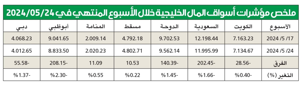 وتراجع مؤشر سوق دبي المالي بنسبة 1.37 بالمئة، أي 55.58 نقطة، ليقفل على مستوى 4012.65 نقطة، ليدخل في المنطقة الحمراء مع المؤشرات الخاسرة لهذا العام، حيث بلغت خسارته نسبة 1.16 في المئة، بعد أن كان مسجلا نموا كبيرا خلال الربع الأول من هذا العام، وكان ذلك بالرغم من الأداء القوي للشركات المدرجة في دبي، حيث أعلن منها 58 شركة ولم يتبقّ سوى 5 شركات لم تعلن، وجاءت نتائجها بنمو إجمالي بنسبة 29.13 في المئة بنمو أرباح 39 شركة مقارنة بالفترة المقابلة من العام الماضي، وتراجع أرباح 13 شركة فقط وتسجيل 6 شركات خسارة. «تاسي» يكسر 12 ألف نقطة وكذلك كسر مؤشر تاسي السعودي، وهو المؤشر الرئيسي لسوق الأسهم في السعودية، وهو الأكبر في الشرق الأوسط، مستوى 12 الف نقطة، للمرة الأولى منذ بداية شهر فبراير الماضي، وهو المستوى المهم جدا للسوق السعودي، بعد أن خسر نسبة 1.66 في المئة الأسبوع الماضي، أي 202.45 نقطة، ليقفل على مستوى 11995.99 نقطة، ليفقد جلّ مكاسب هذا العام ويبقي على نسبة ربع نقطة مئوية فقط مقارنة بإقفال العام الماضي، وأعلنت جل الشركات المدرجة في «تاسي» عن بيانات الربع الأول، حيث بلغ عددها 212 شركة، وحجبت 22 شركة نتائجها، وجاءت بتراجع إجمالي بنسبة 8 بالمئة تقريبا، حيث ارتفعت أرباح 126 شركة، وتراجعت أرباح 47 شركة وخسرت 38.