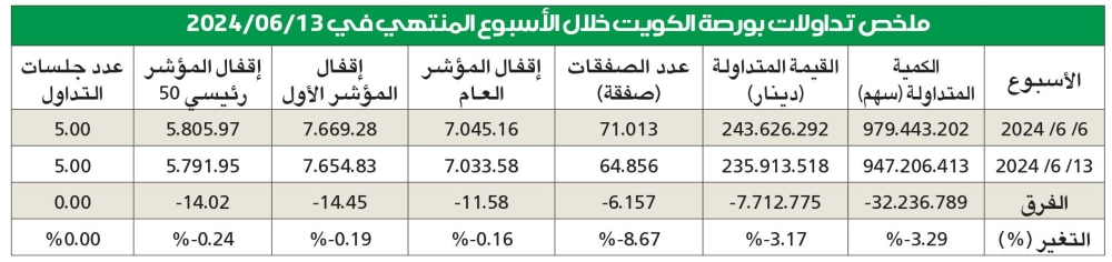 وتراجع مؤشر سوق أبوظبي المالي بنسبة أقل بلغت 0.23 بالمئة، أي 20.56 نقطة، ليقفل على مستوى 8932.94 نقطة، واستمر في حالة تردد كحال بقية الأسواق المالية الخليجية وبانتظار نتائج النصف الأول من العام، التي ستبدأ بعد شهر تقريبا، وكذلك تغيرات الاقتصاد العالمي والأجواء الجيوسياسية الإقليمية التي استمرت دون تغيّر يذكر خلال هذا الشهر. تراجعات محدودة في بورصة الكويت وسجلت تعاملات مؤشرات بورصة الكويت أداء سلبيا خلال الأسبوع الماضي وبتراجعات محدودة، وانخفض مؤشر السوق العام بنسبة 0.16 بالمئة، أي 11.58 نقطة، ليقفل على مستوى 7033.58 نقطة، مستقرا على مكاسب لهذا العام بنسبة 3.2 بالمئة، وكذلك تراجع مؤشر السوق الأول بنسبة 0.19 بالمئة، أي 14.45 نقطة، ليقفل على مستوى 7654.83 نقطة، وتراجعت مكاسبه الى حدود نسبة 2.3 بالمئة قبل انتهاء النصف الأول بأسبوعين فقط و7 جلسات فقط، وتراجع مؤشر سوق رئيسي 50 بنسبة 0.24 بالمئة، أي 14.02 نقطة، ليقفل على مستوى 5791.95 نقطة، وكان أداؤه افضل من مؤشرات السوق العام والأول، حيث بلغت مكاسبه لهذا العام 5.8 بالمئة. وتراجعت متغيرات السوق الثلاثة (القيمة وكمية الأسهم المتداول وعدد الصفقات) مقارنة مع الأسبوع الأول من شهر يونيو، وكان التراجع بنسب محدودة، حيث إنه أسبوع ما قبل عطلة عيد الأضحى، التي غالبا ما يفتر تعاملات الأسواق قبل العطل خوفا من مفاجآتها، وتراجع النشاط والقيمة بنسبة 3.2 بالمئة، بينما تراجع عدد الصفقات بنسبة أكبر قليلا بلغت 6.5 بالمئة، واستقر أداء الأسهم القيادية على خسائر محدودة، وتراجع بيتك ووطني بأقل من نصف نقطة مئوية، بينما كان الارتفاع لسهم بنك الخليج وعلى وقع قرار تحوّله الى إسلامي، حيث حقق ارتفاعا بنسبة 7 بالمئة، وكان سهم يوباك الأكبر ارتفاعا بنسبة 50 بالمئة، ثم أسهم كميفك والمعادن ثم النخيل ومدار، وكانت أسهم ثريا وانوفست وبيان الأكثر خسارة.